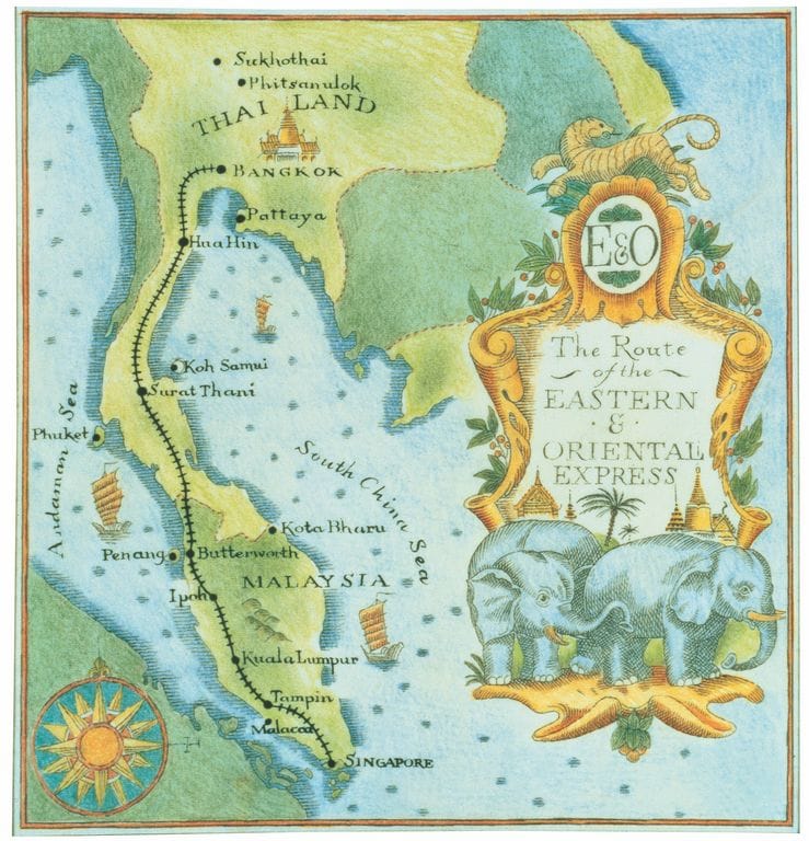 W oczekiwaniu na przejazd na stację kolejową, przy akompaniamencie nostalgicznej muzyki rozkoszowałem się smakiem słynnego drinka Singapore Sling, wynalezionego właśnie w tym hotelu. Tu poznałem również siedzących przy tym samym stoliku podróżnych z innych stron świata. Przed dotarciem na stację przemiły przewodnik opowiedział niezliczone ciekawostki dotyczące Singapuru i życia jego mieszkańców, subtelnie nawiązując do czekającej nas podróży. Pociąg Eastern & Oriental Express, kontynuując tradycję luksusowego konceptu kolei zapoczątkowanego przez siostrzany europejski skład o nazwie Venice Simplon Orient Express, rozpoczął transport pasażerski z Singapuru i Kuala Lumpur do Bangkoku. Luksusowe wagony sypialne i wagony restauracyjne słynące ze swej kuchni sprawiły, że pociągiem podróżowały osoby szlacheckiego pochodzenia, dyplomaci i ludzie biznesu. Dziś Eastern & Oriental Express wozi głównie pasażerów chcących poznać tę część Azji od samego jej wnętrza. Amerykanie, Brytyjczycy, Francuzi, ale też Szwajcarzy i Japończycy umiłowali sobie właśnie taką formę zwiedzania i to oni stanowią stałą klientelę.