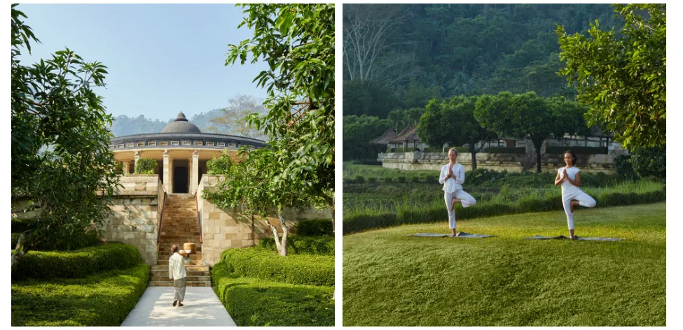 Luxury hotel Amanjiwo Characterized by ancient temples, off-the-beaten-path hikes, and rural life, this is where you'll find inner balance. Enjoy unique Javanese treatments at the sensual spa and savor local cuisine paired with dance and music. Picturesque views of the Borobudur Valley and volcanoes will surely enhance your evening relaxation.