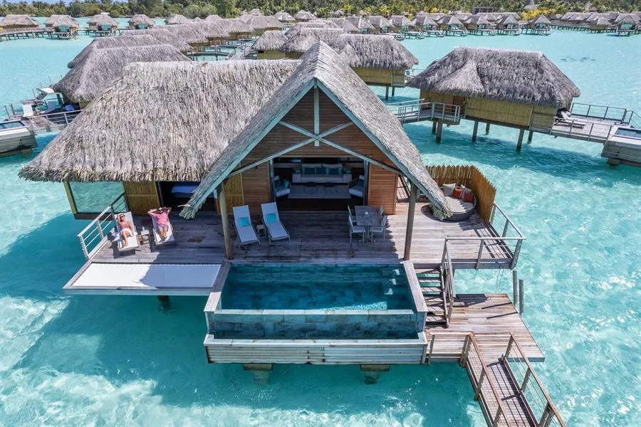 Hotel The St. Regis, part of the famous Starwood Hotels chain, is one of the most luxurious properties in French Polynesia. It is situated in a lagoon with a wonderful view of Otemanu Mountain. The hotel's architecture is a combination of local Polynesian style with modern amenities. This exclusive hotel offers villas with private pools, terraces, pergolas, gardens, and some enjoy private access to a paradise beach. Guests can enjoy a wide range of spa services, exclusive restaurants serving local and international dishes, and a variety of water attractions, such as diving, snorkeling and lagoon cruises. This place is considered a romantic paradise for couples and a popular travel destination for those looking for relaxation in unique surroundings.