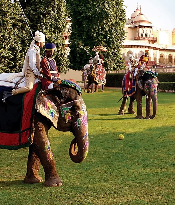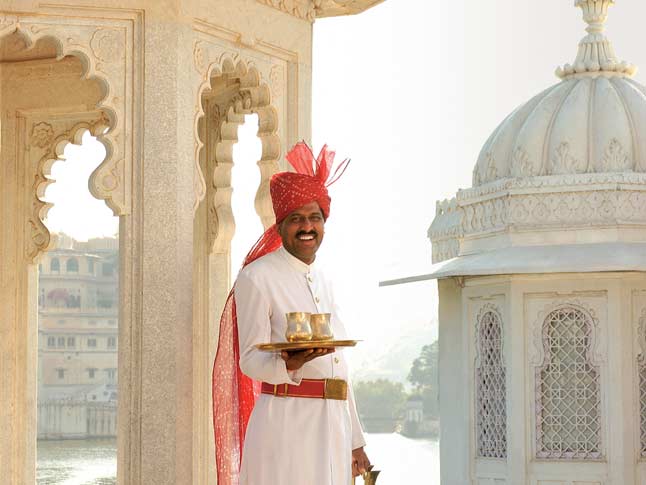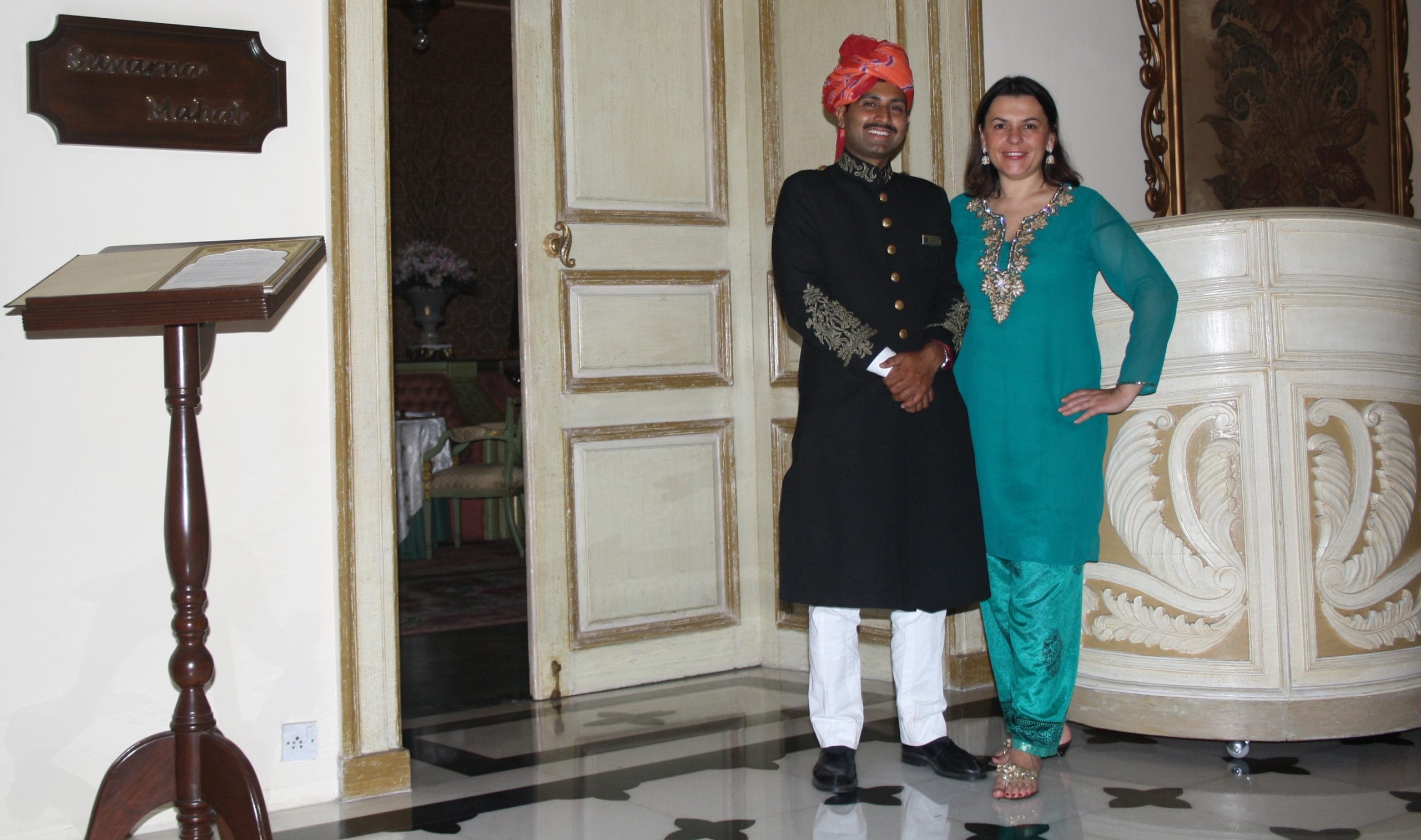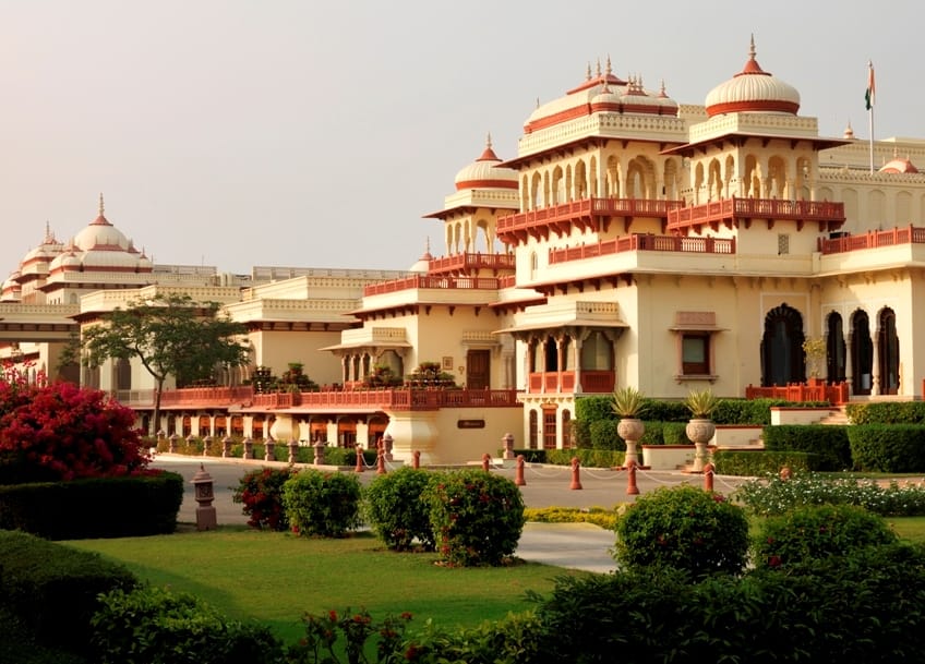 Po dwóch dniach opuściłam miasto, bez wielkiego żalu. Następnym celem podroży dla udających się do Radżasthanu powinna być standardowo Agra. Ponieważ poznałam ją już podczas mojej pierwszej podroży po Indiach, nie miałam potrzeby tam wracać. Tak jak Tadż Mahal, który jest jednym z siedmiu cudów świata, wypada zobaczyć raz w życiu, tak samo miasto Agra zdecydowanie nie należy do indyjskich perełek. Następnym punktem mojej podroży był Dżajpur, tzw. Różowe Miasto, stolica Radżasthanu. Tym razem miałam program dostosowany do moich zainteresowań, miałam poznać najpiękniejsze hotele usytuowane w zabytkach. Przejazd z Delhi do Dżajpuru przez rolnicze tereny, małe miasteczka i ubogie, ale kolorowe wioski, jest interesującą wycieczką samą w sobie. Po kilkugodzinnych zmaganiach kierowcy i rajdzie wśród starych, ale nader fantazyjnie przybranych blaszanych ciężarówek, wszechobecnych ospałych krów, setek pasterzy ze stadami kóz, dotarliśmy do celu. Hotel Rambagh Palace leży w samym centrum trzymilionowego Dżajpuru i jest żywą legendą. Nadal zamieszkuje go królewska rodzina. W roku 1957 został oddany przez właścicieli w zarządzanie znakomitej sieci Taj Hotels. Nie owijając w bawełnę – Rambagh Palace jest oficjalnie uznany za jeden z najlepszych hoteli na świecie pod względem architektury, wystroju wnętrz, kuchni i obsługi. Przy wejściu widzę wąsatego odźwiernego w białym mundurze, witającego gości z obowiązkową czerwoną parasolką.