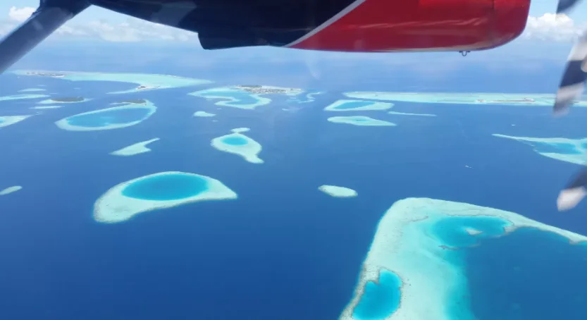 Вид на восходящее солнце из самолета был ошеломляющим, а то, что появилось под нами, действительно напоминало брошенный в море жемчуг. Сам палец пробегает по иллюминатору самолета, указывая на красивые морские образования. Постоянно появляющиеся за окном новые виды вызывают крики: «Смотрите! И там! И вот оно! Мальдивы с высоты птичьего полета и начало райской эйфории – отныне для нас это синонимы. Мы приземлились около 10.00:XNUMX по местному времени. Первое впечатление – аэропорт не впечатляет. Внутри конструкции из листового металла нет системы кондиционирования воздуха, а сантехническое оборудование уже прошло свой расцвет. Стандарты отличаются от европейских, но незначительно. Это неудивительно, поскольку страна борется за выживание из-за повышения уровня моря. Разумеется, тщательный досмотр багажа исключает возможность провоза, среди прочего: алкоголь (как хранение, так и употребление запрещены). Однако для туристов будет сделано все, поэтому на курортах эти правила не распространяются. В аэропорту был небольшой хаос относительно того, кто куда и с кем должен ехать, но у нас не возникло особых проблем с поиском сотрудника сети люксовых отелей LUX*, одетого в фирменную форму. Он отвел нас в VIP-зал. Просторный, эксклюзивный, предварительный просмотр того, что ждет гостей в отелях сети не только на Мальдивах. Здесь можно выпить вкусный кофе от бренда Cafe Lux* и попробовать свежеприготовленные деликатесы. Ожидание следующего рейса было не слишком долгим. Не успели мы устроиться и примерить идеальное маленькое черное платье, как нам пришлось идти к ожидавшему нас гидросамолету. Было грустно покидать VIP-зал с кондиционером и прощаться с прекрасным персоналом, но мы знали, что после такого чудесного знакомства нас ждет много замечательных моментов. Примерно через дюжину минут мы отправились в полет продолжительностью менее получаса до атолла LUX* South Ari Atoll. Беруши и беруши обязательны!