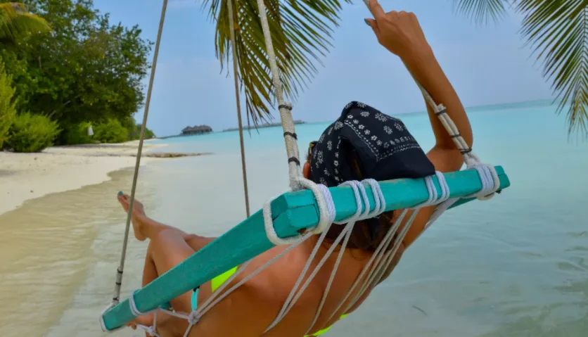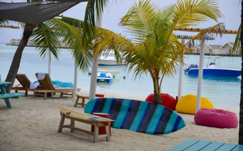 Во время нашего пребывания мы также приняли участие в традиционном ужине «Мальдивская ночь», во время которого можно послушать традиционную музыку мальдивцев, увидеть их танцы (и даже поучаствовать в них) и сделать татуировку хной. Во время нашего пребывания состоялся «Час Земли» — акция, проведенная в более чем ста странах по отключению света во имя защиты окружающей среды. Это была возможность приготовить на пляже чрезвычайно атмосферный ужин, приготовленный без электричества. Во время ужина прошла презентация о явлении Эль-Ниньо и его последствиях для всей экосистемы океана, особенно для Мальдивского архипелага. Для желающих увидеть подводный мир поближе каждый день организуются морские прогулки к близлежащему коралловому рифу. Рядом с островом можно встретить и поплавать с самой большой акулой в мире – китовой акулой. Несмотря на грозное название, это чрезвычайно мирная рыба, питающаяся планктоном. Однако его длина достигает 20 м, а кожа у него самая толстая из всех животных (10 см). После изнурительной борьбы в океане приятно было расслабиться в баре с декором на серфинговую тематику, а потом посидеть в воде на большом надувном лебеде.