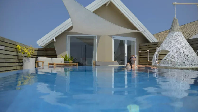 Во время нашего пребывания приятным сюрпризом стала смена номера на эксклюзивный 110-метровый так называемый Романтическая вилла на воде с бассейном. Тщательно оформленный интерьер заставил нас почувствовать себя особенными. Подсветка столешницы умывальника, детали на стенах и зеркала, плавно меняющие цвет, создавали необыкновенную атмосферу. Также есть терраса с большим открытым бассейном, из которого можно любоваться восходом солнца над Мальдивами, и большие подсвеченные вечером качели в форме кокона, где можно провести вечер с бокалом вина. Днем можно спрятаться под парусообразной крышей и развлечься, а чтобы охладиться, можно спуститься по широкой лестнице прямо к океану. Вилла хоть и очень современная (что покорило наши сердца), но при этом очень практичная, просторная и удобная. Когда мы вернулись в деревню, нам в голову пришла одна мысль: рай существует!